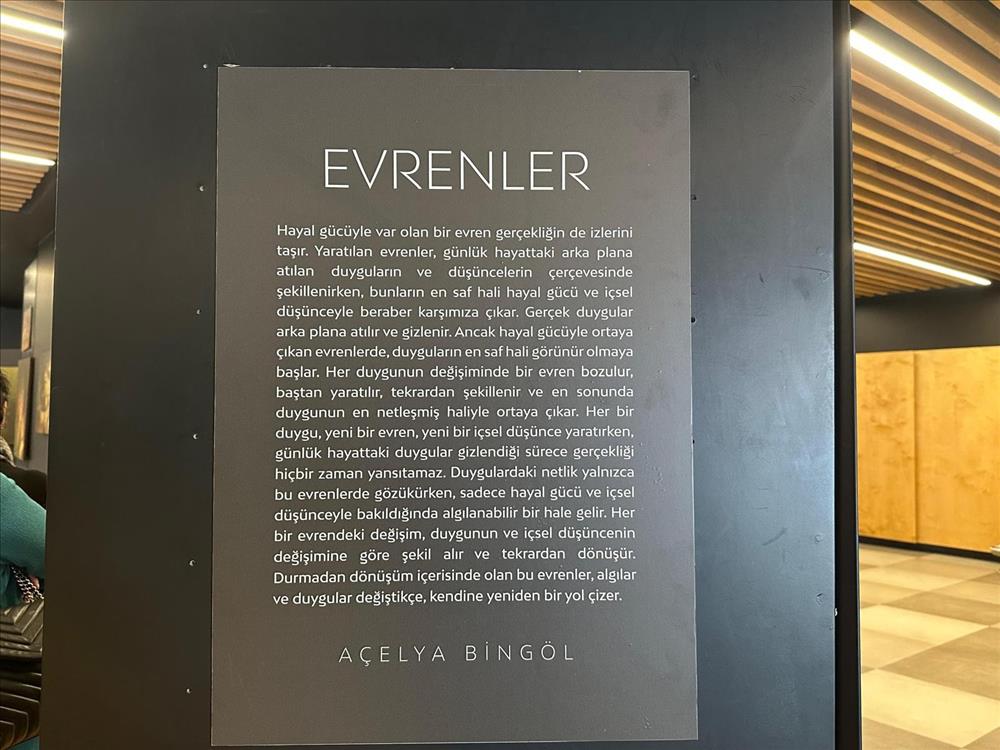Hayal gücüyle var olan bir evren gerçekliğin de izlerini taşır. Yaratılan evrenler, günlük hayattaki arka plana atılan duyguların ve düşüncelerin çerçevesinde şekillenirken, bunların en saf hâli hayal gücü ve içsel düşünceyle beraber karşımıza çıkar. Gerçek duygular arka plana atılır ve gizlenir. Ancak hayal gücüyle ortaya çıkan evrenlerde, duyguların en saf hâli görülmeye başlar. Her duygunun değişiminde bir evren bozulur, baştan yaratılır, tekrardan şekillenir ve en sonunda duygunun en netleşmiş hâliyle ortaya çıkar. Her bir duygu yeni bir evreni, yeni bir içsel düşünce yaratırken, günlük hayattaki duygular gizlendiği sürece gerçekliğini hiçbir zaman yansıtamaz. Duygulardaki netlik yalnızca iç evrenlerde gözükürken, sadece hayal gücü ve içsel düşünceyle bakıldığında algılanabilir bir hâle gelir. Her bir evrendeki değişim, duygunun ve içsel düşüncenin değişimine göre şekil alır ve tekrardan dönüşür. Durmadan dönüşüm içerisinde olan bu evrenler, algı ve duygular değiştikçe, kendine yeniden bir yol çizer.” AÇELYA BİNGÖL